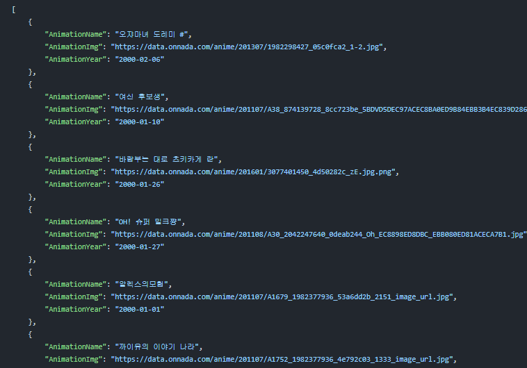 각 애니메이션 링크에서 상세 정보를 추출합니다. 애니메이션 이름, 이미지 링크, 방영 연도를 가져와 딕셔너리 형태로 저장합니다.