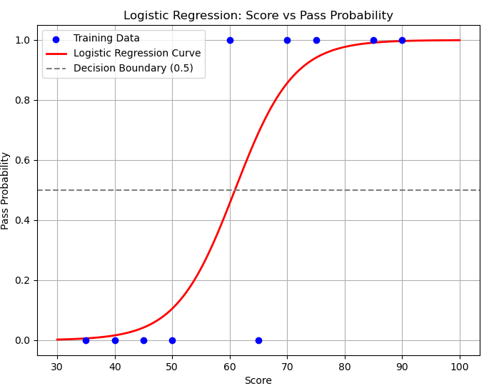 probabilities = model.predict_proba(scores)[:, 1] # 클래스 1(통과)의 확률