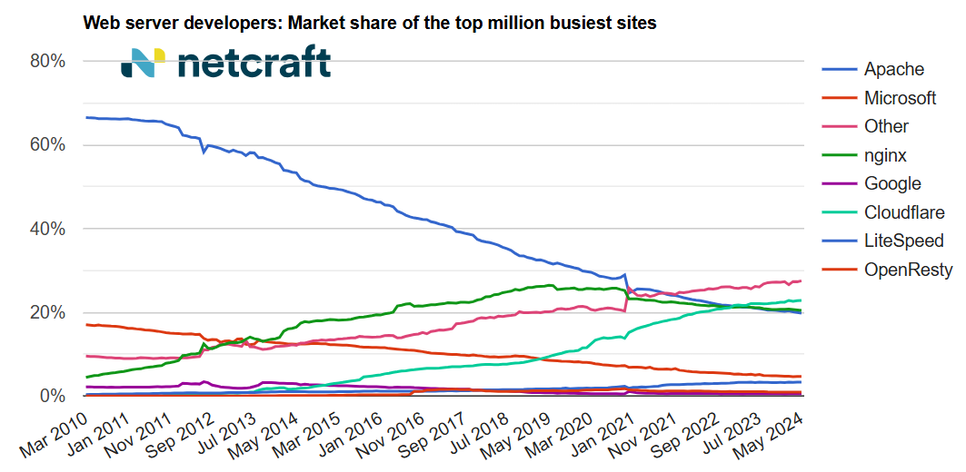 2024 5월 기준으로 nginx가 아파치보다 더 선호된다는 조사결과도 있다.
